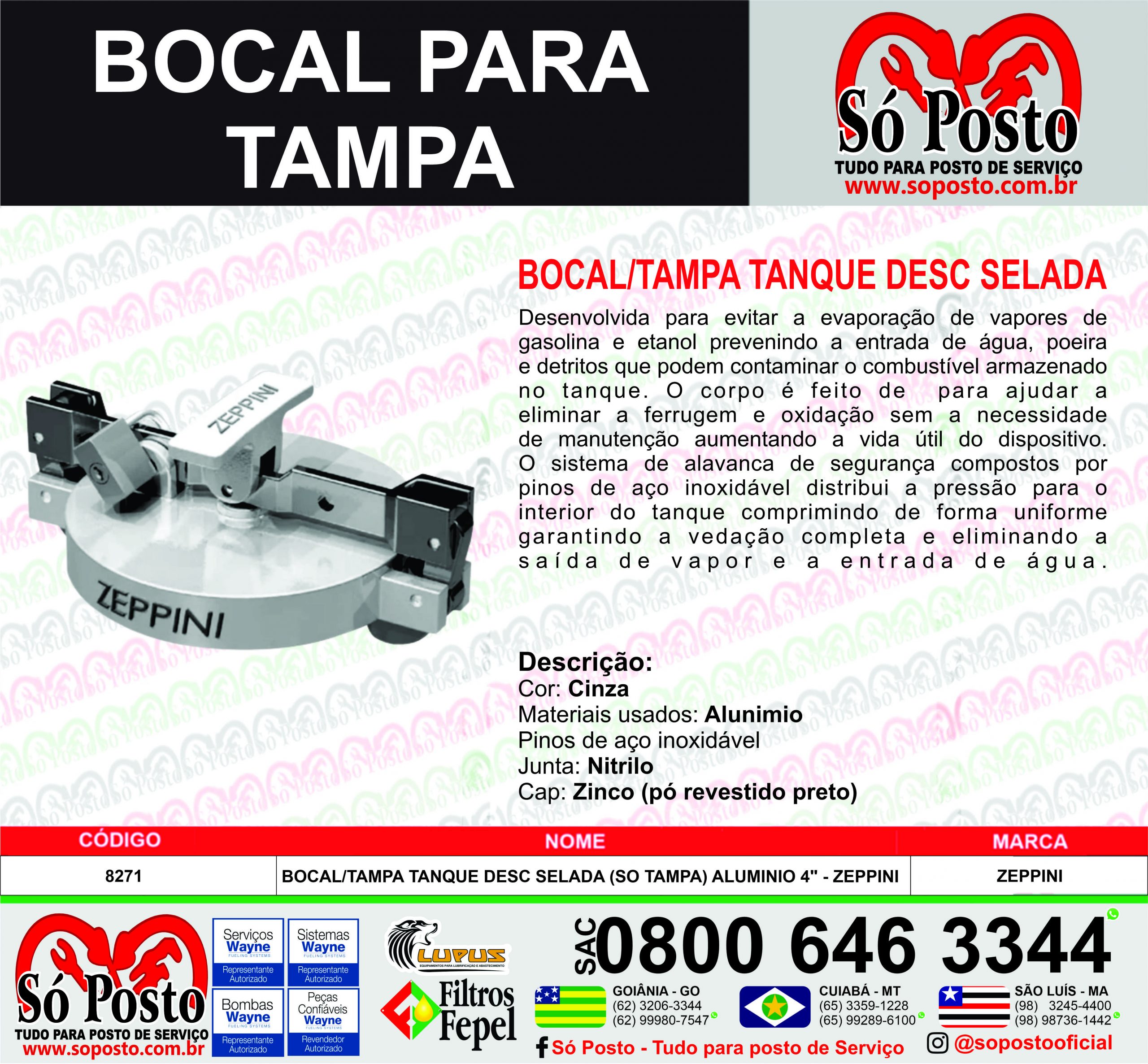 O "BOCAL/TAMPA TANQUE DESC SELADA (SO TAMPA) ALUMINIO 4" - ZEPPINI" refere-se a um bocal/tampa de descarga de tanque selado em alumínio (apenas a tampa) com diâmetro de 4 polegadas , fabricado pela Zeppini Ecoflex.