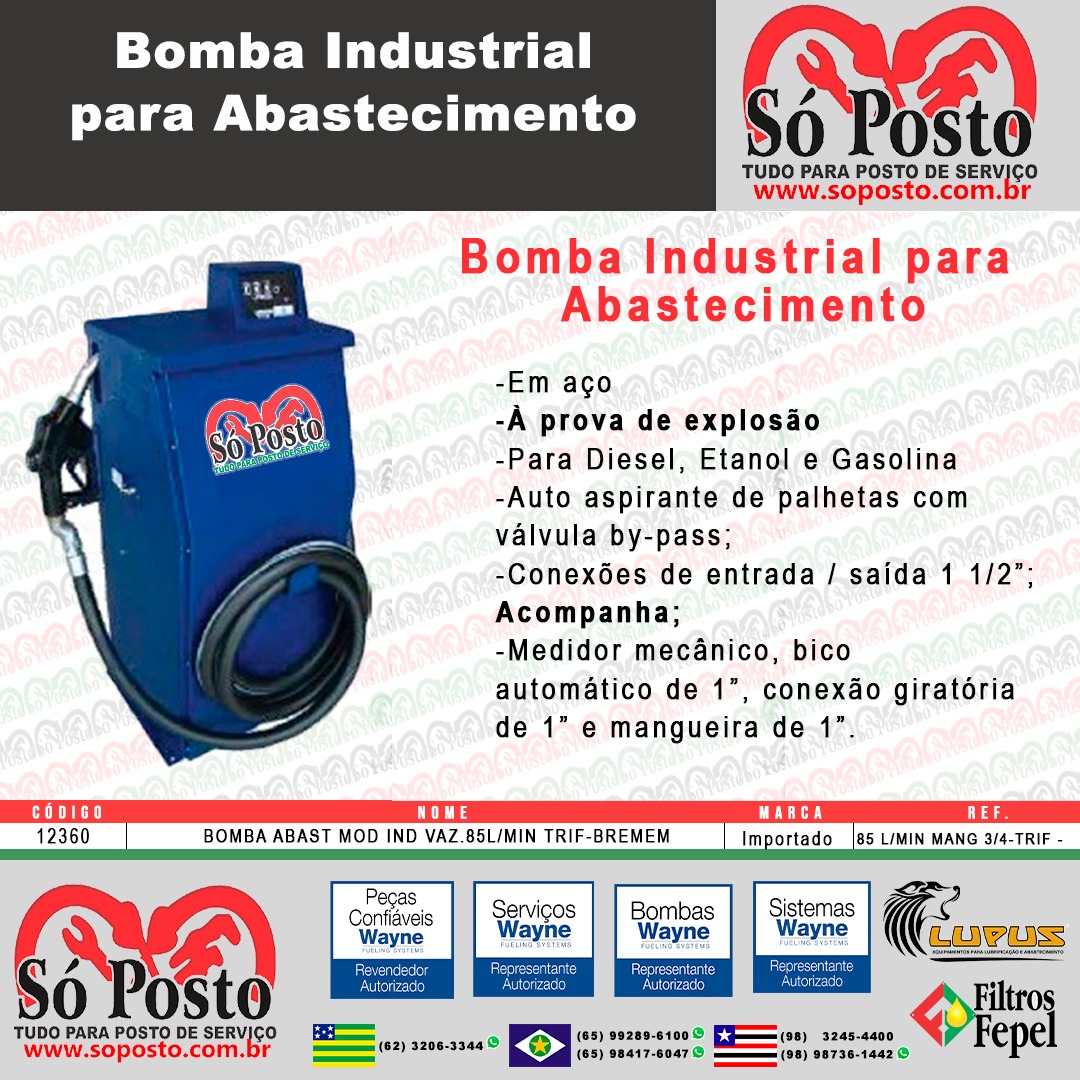 Bomba industrial Bremen, com bico de abastecimento automático e vazão de 85 L/min, 01 bico – 01 produto, Industrial – para consumidor, vazão 85 LPM - A Bomba é utilizada em indústrias, transportadoras, garagens e outros estabelecimentos que necessitam de um ponto de abastecimento de combustível.
