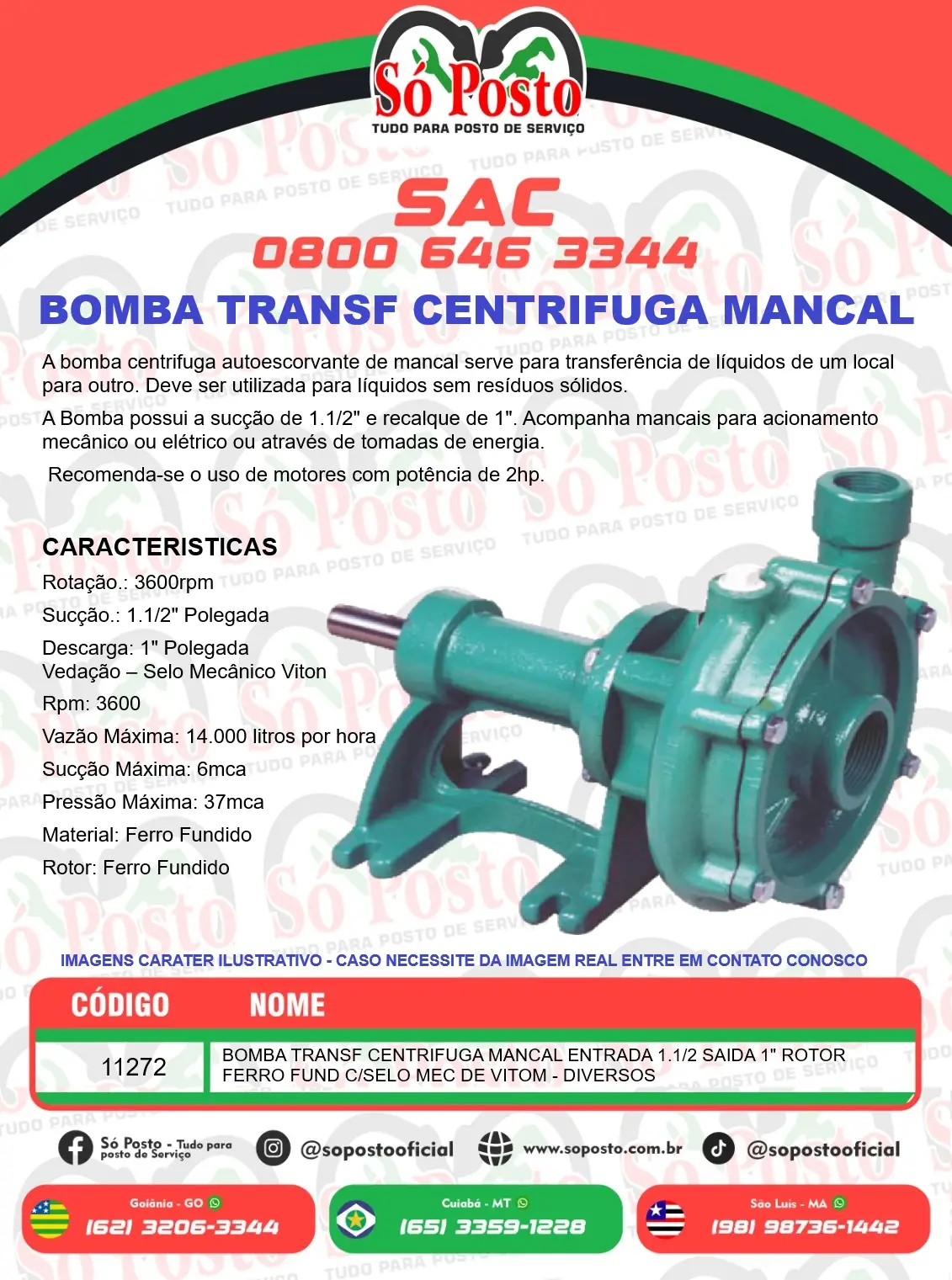 A Bomba possui a sucção de 1.1/2″ e recalque de 1″. Acompanha mancais para acionamento elétrico ou através de tomadas de energia.