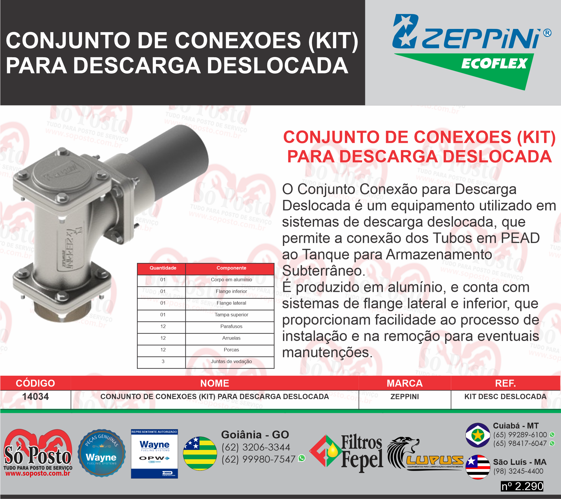 O CONJUNTO DE CONEXÕES (KIT) PARA DESCARGA DESLOCADA C/PONTEIRA CURTA da Zeppini é um componente essencial para sistemas de descarga deslocada em tanques de armazenamento subterrâneo de combustíveis. Sua principal função é interligar a tubulação de descarga ao tanque, garantindo uma conexão segura e eficiente.