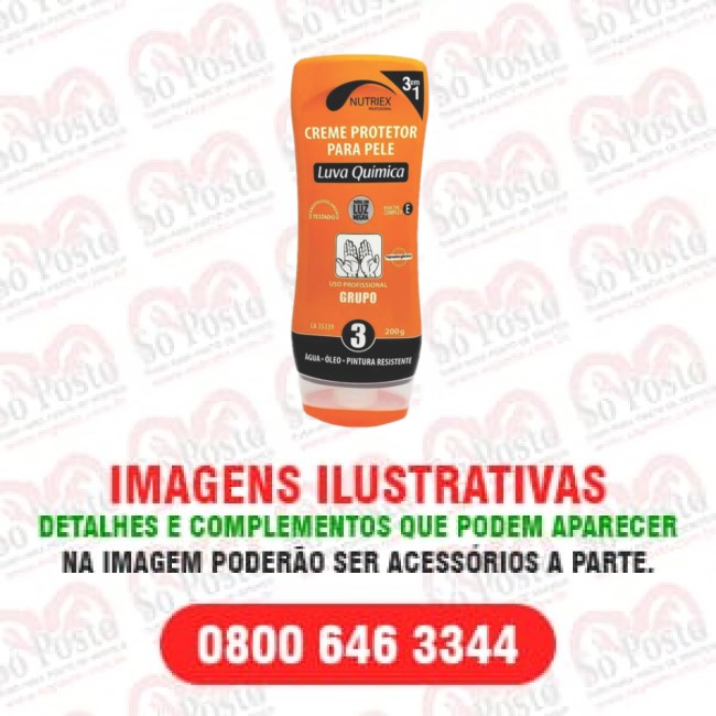 O "CREME PROT P/PELE(MAOS) LUVA QUIM PROTET PELE GRUP 3 X 200 GRAMAS - NUTRIEX" é um creme protetor para a pele das mãos, classificado como "luva química" de Grupo 3, fabricado pela Nutriex, e disponível em embalagens de 200 gramas.