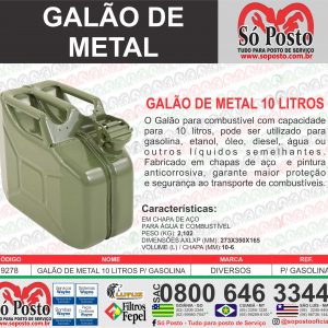Um galão de metal de 10 litros para gasolina é um recipiente robusto e seguro projetado para armazenar e transportar gasolina e outros combustíveis de forma segura. feito de aço resistente, muitas vezes com revestimento interno para evitar ferrugem e corrosão, ele oferece durabilidade e proteção contra vazamentos e derramamentos.
