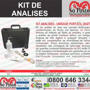 A “KIT ANALISES – UNIDADE PORTÁTIL DIGITAL PARA ANÁLISE DE FLUÍDOS – LUPUS” (código 5781) é uma solução completa e portátil para verificar a contaminação de fluidos de forma rápida e confiável. De acordo com a LUPUS Lubrificação e outras fontes, este kit oferece os seguintes recursos e benefícios: