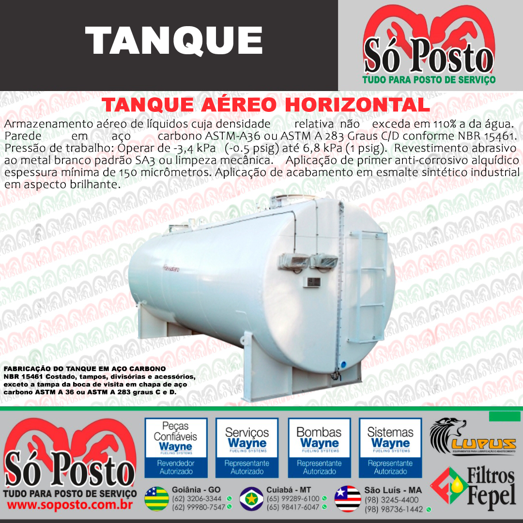 Fabricados em aço carbono, os tanques aéreos podem ser nos formatos horizontais (fornecidos com berços metálicos ou reforços estruturais nos costados) ou verticais (com fundos planos, decimais ou cônicos), sempre em conformidade com as mais rígidas normas nacionais e internacionais, como a NBR 15.461.