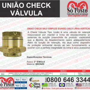 A União Check Válvula Dupla União com Vedação Simples, fabricada em latão/bronze e com conexão de 2 polegadas, sem mola, é um tipo de válvula de retenção projetada para permitir o fluxo de fluidos em apenas uma direção, impedindo o refluxo.